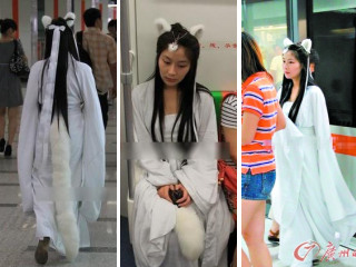 據了解,關於白 狐少女出現在上海地鐵的組圖早在8月就已出現,最近又有網友在論壇中發文表示,白狐少女近日又頻頻現身上海地鐵。1號綫的錦江樂 園 和2號綫的南京東路都能見到這位白狐少女的身影。只見這位白狐少女面容清秀姣好,身穿白色長裙,頭上一對毛茸茸的「耳朵」豎立起來,還扎着一條白色絲帶。 最為惹眼的則是其身後拖着的一條約有一公尺多長的尾巴。
