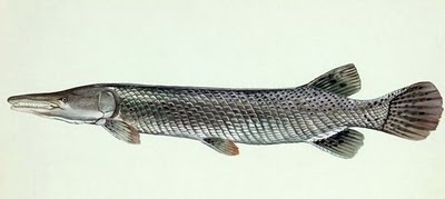 gar,原分布於北美密西西比河流域,體長可達1公尺以上,是同類體型最龐大的一種,曾有超過2公尺的紀錄;鱷雀鱔的親戚有嘴部尖長的長吻雀鱔、嘴部較短
